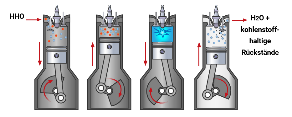 Der H2 BLASTER erzeugt durch Elektrolyse Knallgas, ein Gemisch aus Wasserstoff und Sauerstoff, dass bei laufendem und warmen Motor in das Ansaugrohr eingeleitet wird und so in den Brennraum gelangt.